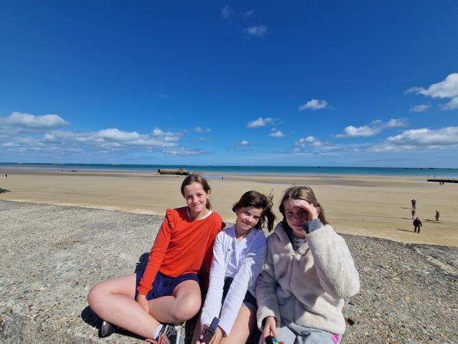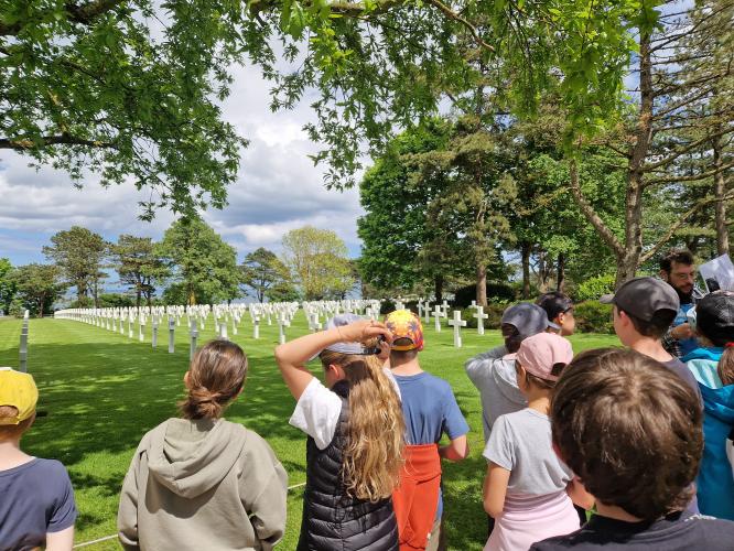 Nous sommes partis en bus au musée d'Arromanches. Nous avions des casques audios pour écouter des témoignages. Après, on a pique-niqué et nous avons visité les Batteries de Longues-sur-Mer. Nous sommes partis au cimetière Américain et c'était très beau avec la plage d'Omaha Beach en contrebas. Ensuite, nous sommes partis au cimetière allemand de la Cambe. Certaines tombes sont faites de roches volcaniques. Nous y avons récité des poèmes dont "Liberté" de Paul Eluard.
