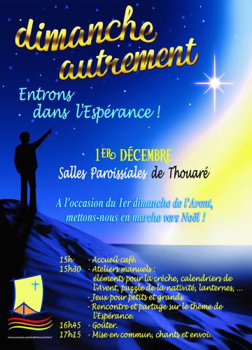 Venez nombreux, en famille, entre amis participer à l'après-midi "Dimanche autrement" le 1er Décembre à la salle paroissiale de Thouaré (infos sur l'affiche ci-jointe). Il y aura des activités pour tous les âges.
